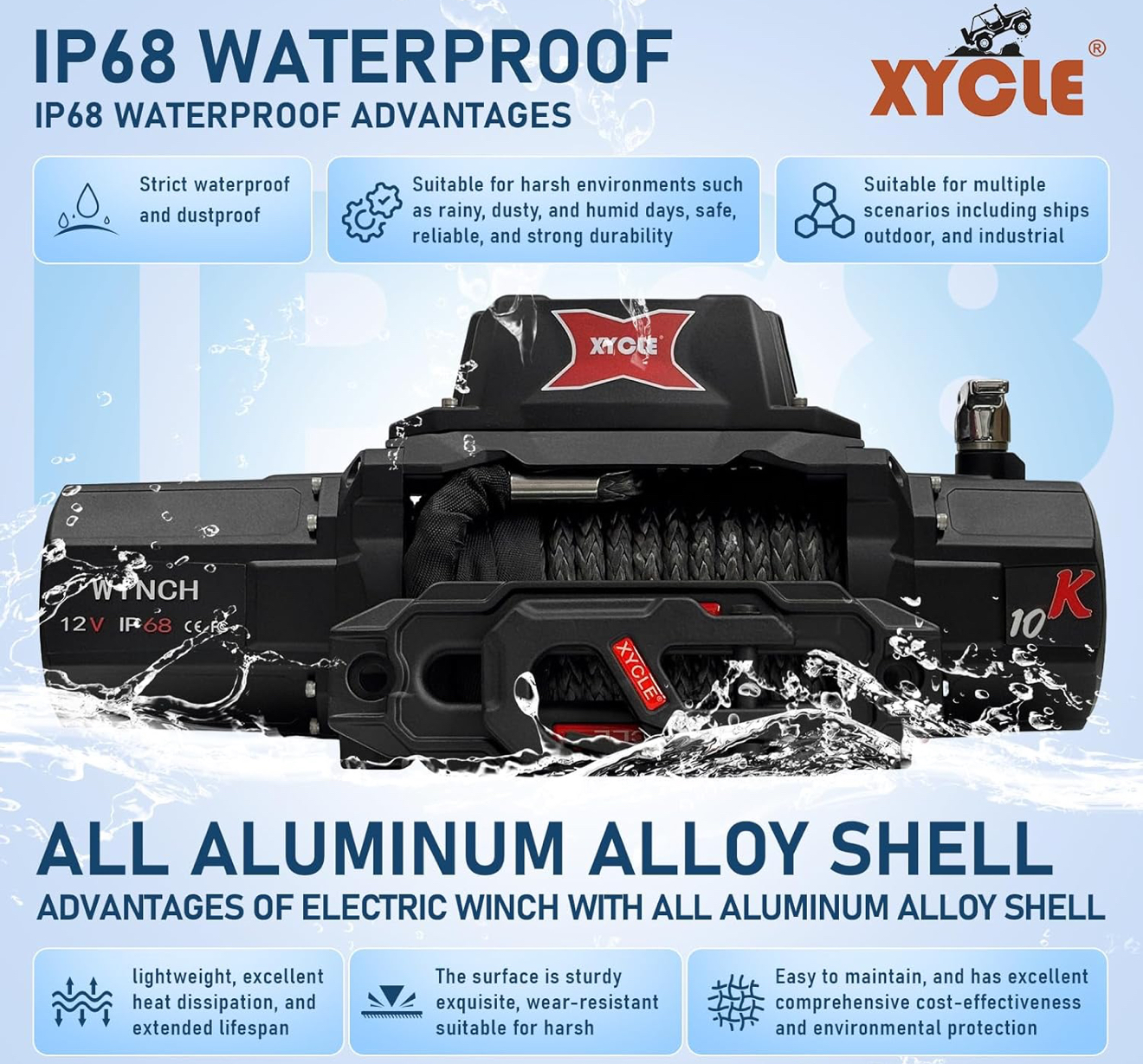 - 【 New design and precision manufacturing process 】 XYCLE unique appearance design provides IP68 waterproof, dustproof, and moisture-proof traction winch. The overall winch adopts aviation grade aluminum alloy precision die-casting, which is lightweight and has good heat dissipation performance that ordinary winches cannot possess. The 3-level planetary gears and gear rings are all made of precision cold extruded high-strength alloy steel, with a gear ratio of 218:1 and stable and strong power output. The motor uses all purple copper coils to ensure super strong power output and durability of the motor