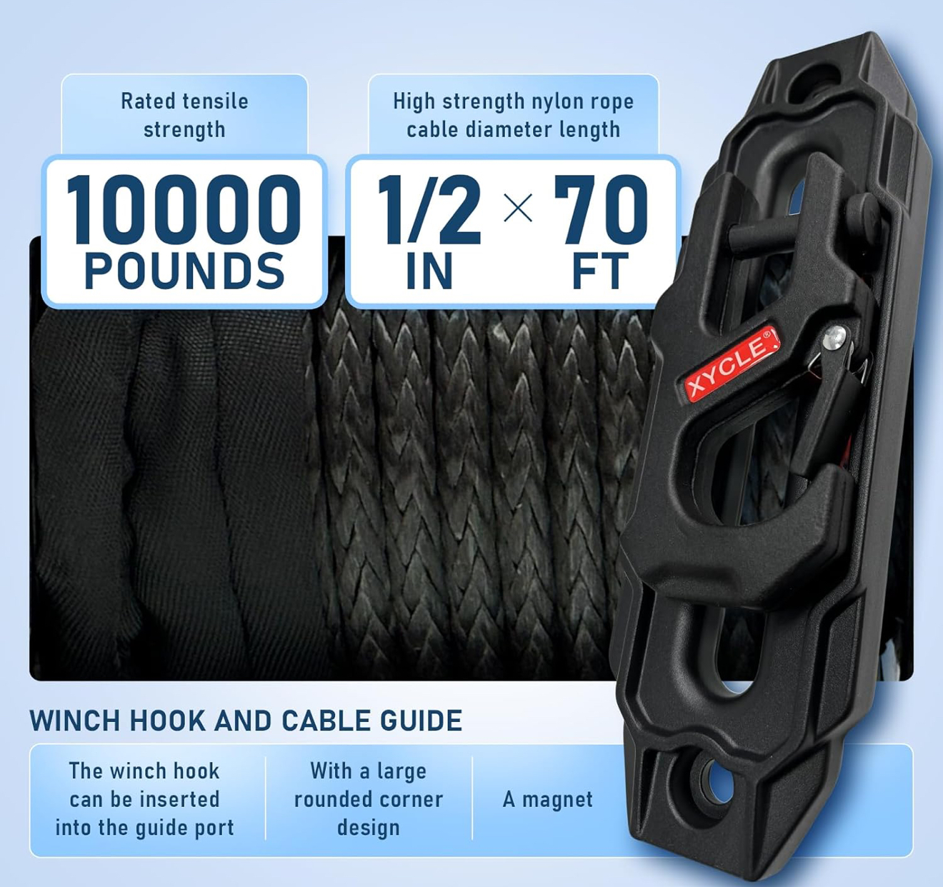 - 【 Unique Features and Configuration 】 The XYCLE trailer winch clutch adopts a unique pull type design, effectively avoiding the embarrassing situation of ordinary winch clutch not engaging. The off-road winch is equipped with a 1/2 inch synthetic rope with a length of 70FT and high-strength UHMWPE material, which is safer and more secure than the ordinary 3/8 synthetic rope winch. The control box shell is designed with aluminum alloy material for the first time, which can quickly reduce the high temperature of the relay during use, effectively protect your equipment from normal operation, and extend the service life of the equipment