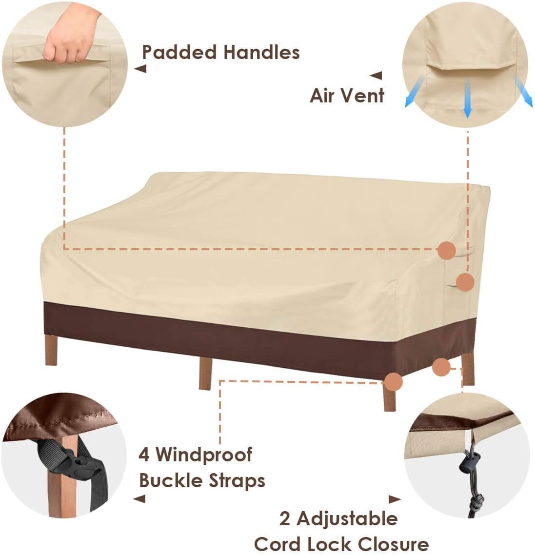 - Waterproof and UV Resistant: Oor’s durable patio furniture covers have a UV-stabilized, waterproof coating and a waterproof laminated backing that prevents water from seeping through the cover and keeps your outdoor sofa dry and usable. Humanized Design: Wide padded handles make it easier to put on and take off. It can also be used for hanging and storage. Two closure straps help ensure the cover fits snugly and prevent it from blowing away on windy days. The vent design reduces interior condensation and wind resistance.